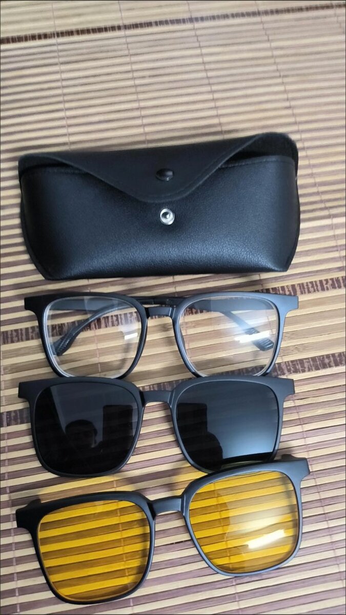 Универсальные очки в чёрной оправе с прозрачными линзами на -1.50. В комплекте съёмные магнитные насадки с затемнёнными линзами, которые легко крепятся и снимаются. Удобный вариант для тех, кто хочет иметь зрительные и солнцезащитные очки в одном практично и быстро адаптируется к разным условиям.