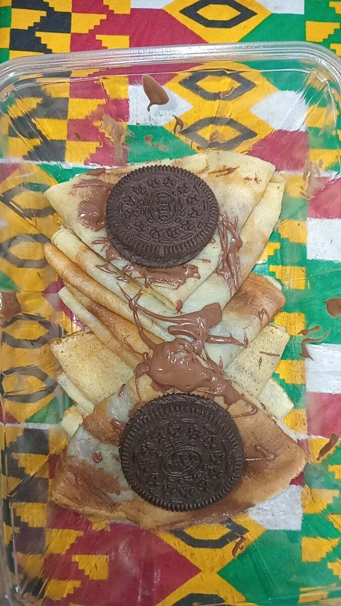 Dégustez ces crêpes moelleuses faites maison, garnies de biscuits au chocolat et d'un filet de chocolat fondant. Parfaites pour un dessert gourmand ou une collation sucrée. Prêtes à ravir petits et grands, elles apporteront une touche de douceur à toute occasion.