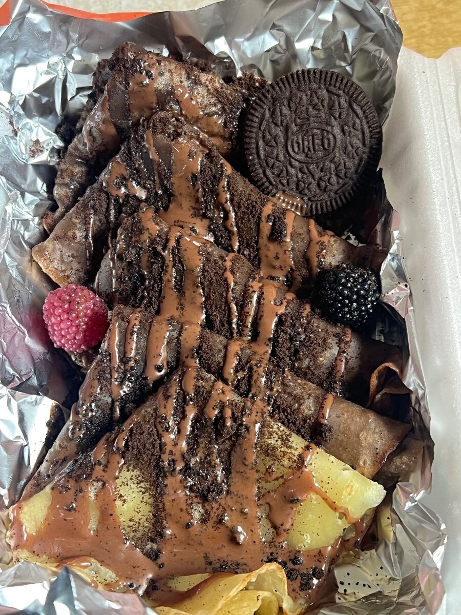 10 crepes ( Découvrez notre nouvelle crêpe délicieuse ! Notre pâte est faite avec du Nutella, et nous y ajoutons une couche supplémentaire de Nutella après cuisson. Pour une texture croquante, nous écrasons des biscuits OREO sur le dessus. Et pour une touche de sucrerie, nous accompagnons nos crêpes de bonbons Haribo. Un dessert gourmand et amusant qui va vous faire craquer !") merci
