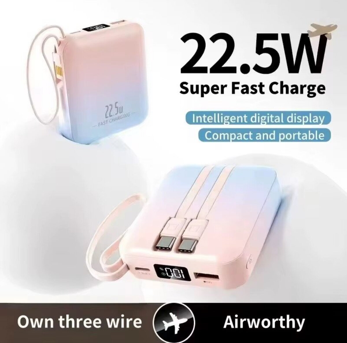 Experience high-speed charging with our 22.5W Power Bank. It features an intelligent digital display and is compact and portable. Perfect for travelers, it includes multiple built-in cables and is airworthy. Stay powered on-the-go with this efficient and convenient device.