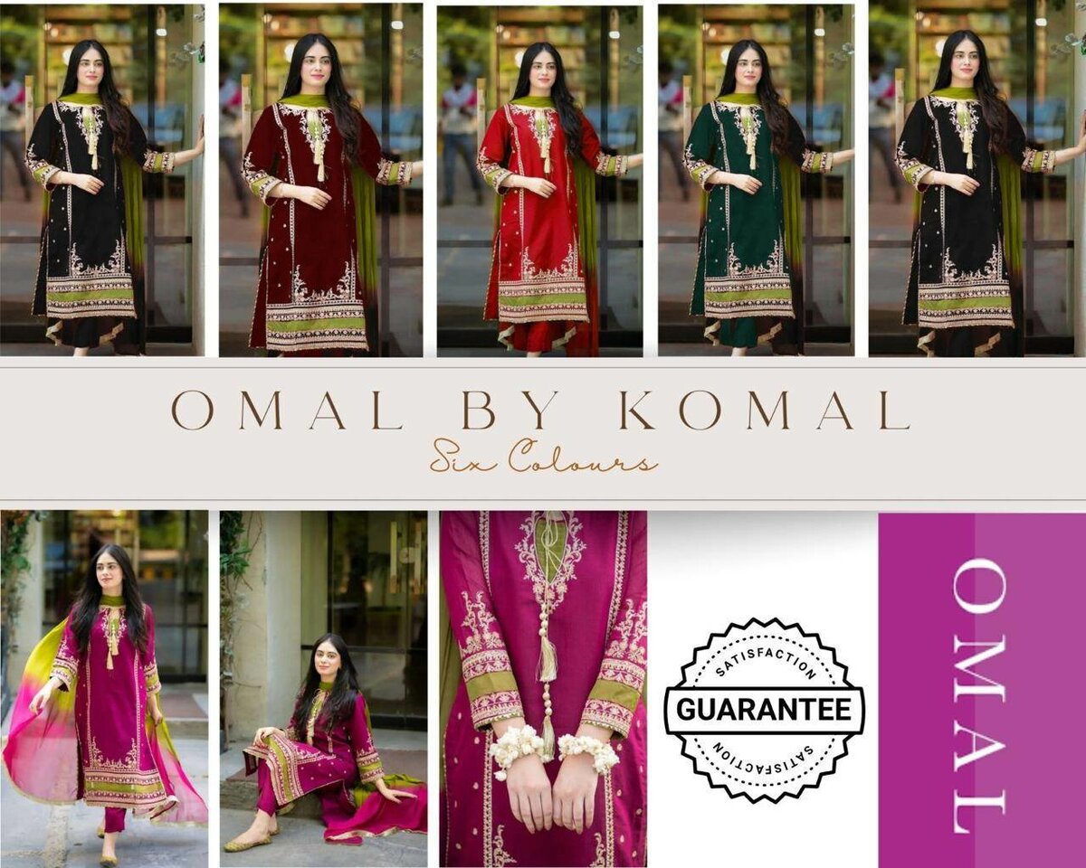 short description: "OMAL by Komal" presents a stunning magenta outfit featuring delicate golden embroidery, elegant tassels, and a vibrant green-pink ombré dupatta perfect for festive or semi-formal occasions.