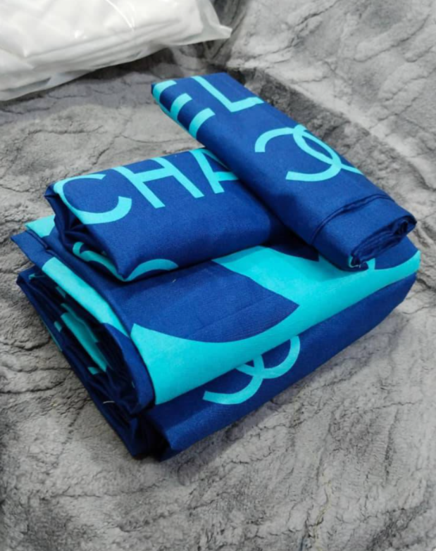 Set duvet cover, sheet + 2 pillowcases, blue Chanel print