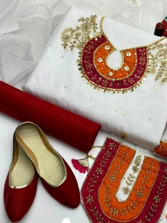 Package Includes: 1 x Shirt, 1 x Trouser, 1 x Dupatta, 1 x Pair of Khussa, 1 x Clutch