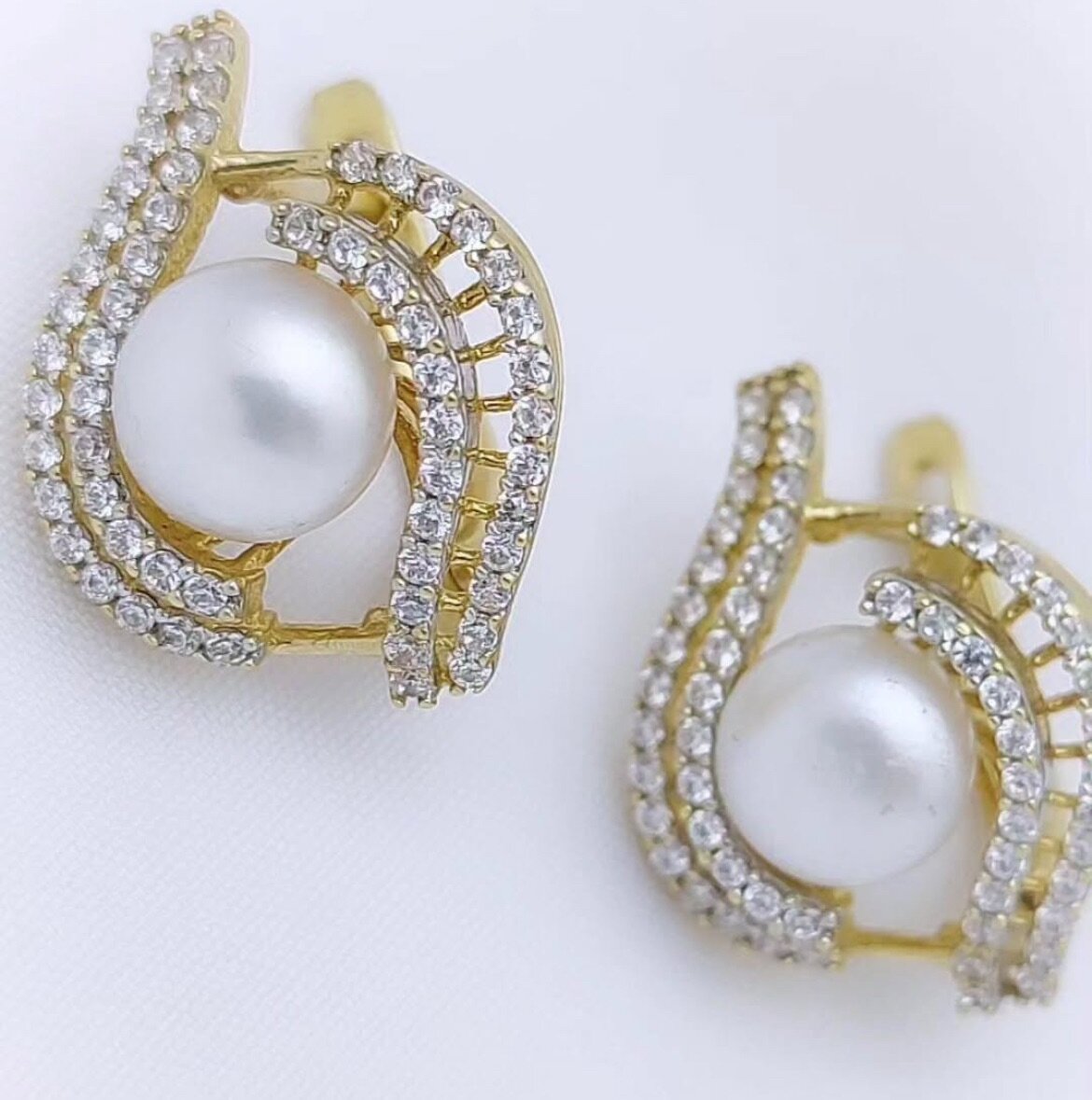 Серьги в жёлтом золоте 585 ,с жемчугом и цирконами Вес:5,66