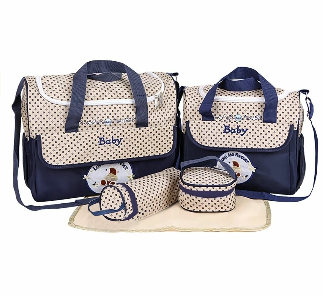 Perfect for parents on the go, this 5-piece diaper bag set includes two large bags, bottle holder, diaper mat, and accessory pouch. Made from durable materials with a cute polka dot design, it's spacious and organized. Ideal for everyday use or travel, keeping all baby essentials accessible and tidy.