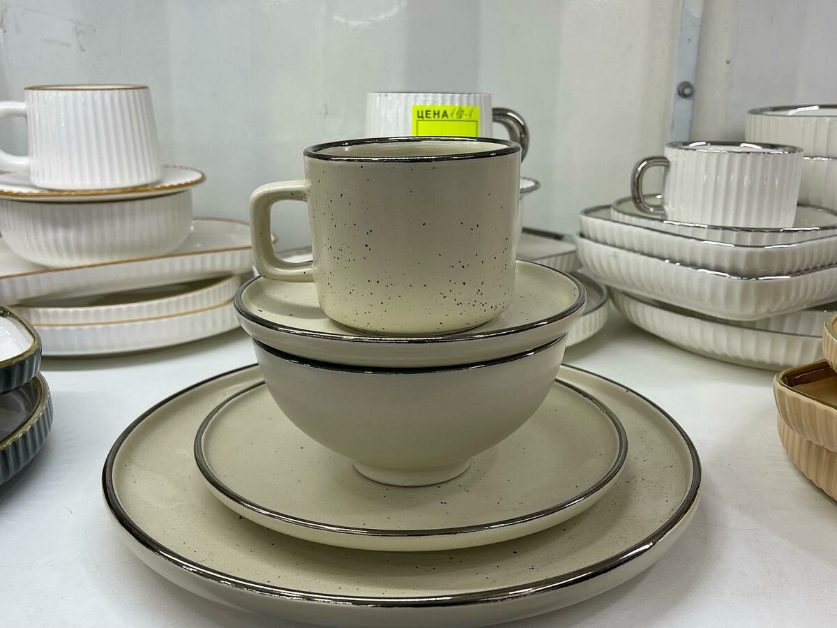 Постановочная тарелка 6 • Закусочная тарелка 6 • Супница 6 • Чайная пара 6+6 • Салатница 2 • Нарезка 2