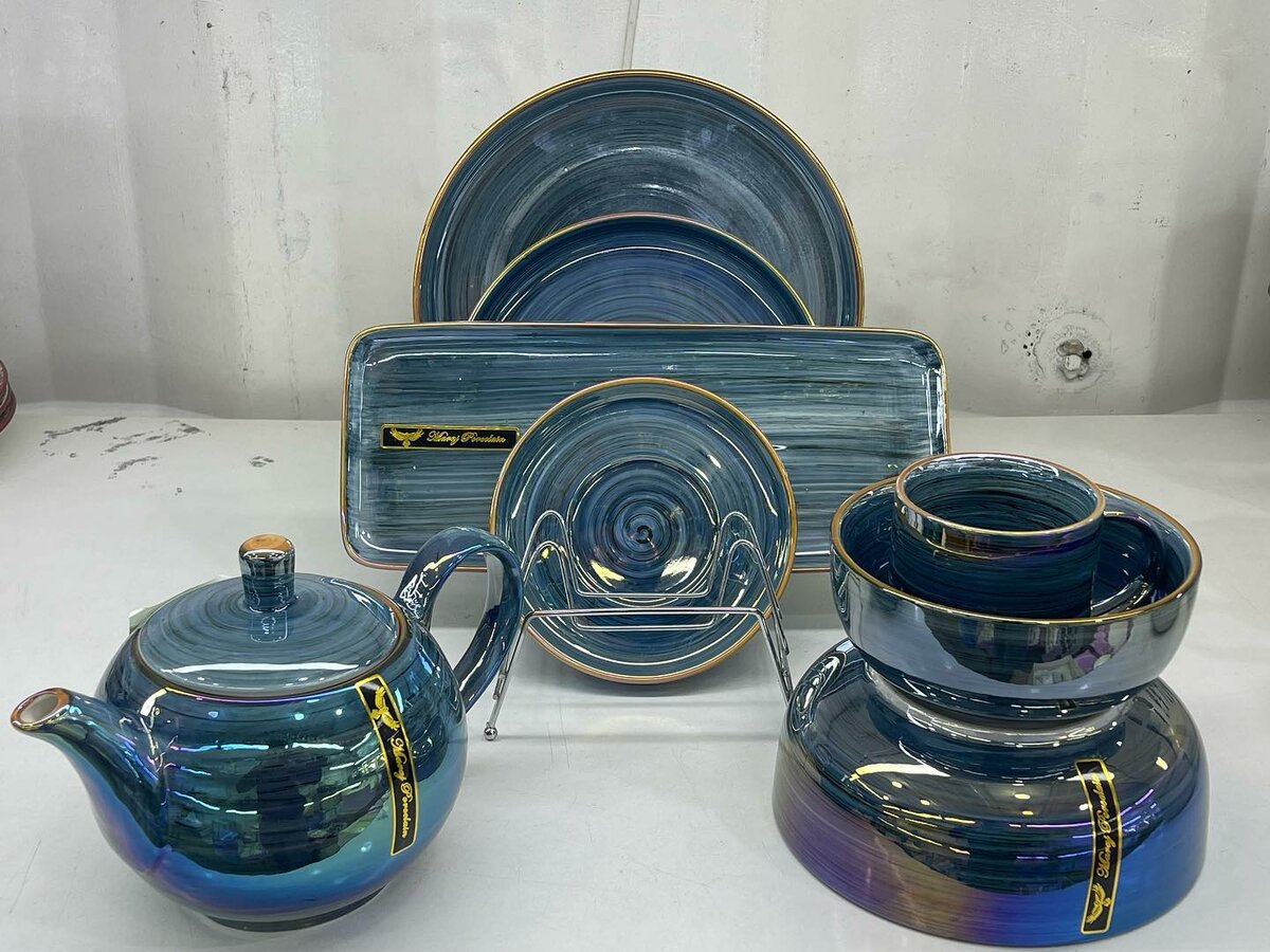• Постановочная тарелка 6 • Закусочная тарелка 6 • Десертная тарелка 6 • Супница 6 • Салатница 1 • Тарелка для нарезок 1 • Чайник 1