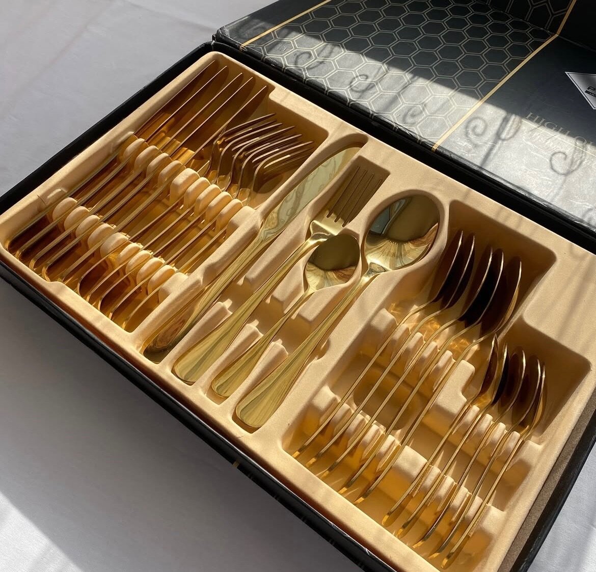 Столовые приборы на 6 персон Данный набор включает в себя комплект из чайных и столовых ложек, вилок и ножей. Приборы изготовлены из нержавеющей пищевой стали и безопасны для здоровья.