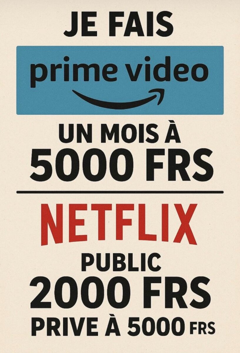 Profitez d'offres exceptionnelles sur Prime Video, Netflix et Spotify. Obtenez un mois de Prime Video à 5000 FRS ou accédez à Netflix à partir de 2000 FRS pour le public et 5000 FRS en privé. Bénéficiez également d'un compte Spotify individuel privé pour un an à 20 000 FRS. Idéal pour les amateurs de divertissement illimité !
