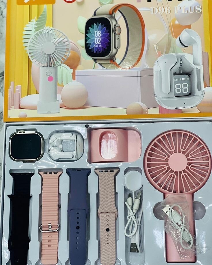 Laccessoire parfait qui facilitera votre quotidien de vie avec un pack vous disposer dun ecouteur connecté d'une montre connectée, ventilateur et quatre poignet de montre