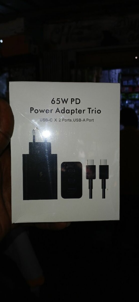Chargeur rapide 65W avec 2 ports USB-C et 1 port USB-A. Idéal pour charger plusieurs appareils simultanément.