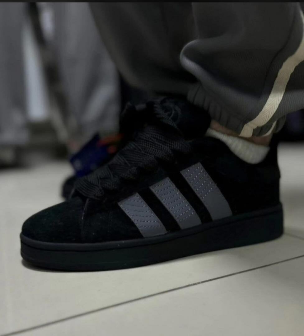 Baskets noires stylées à trois bandes pour un look moderne et confortable. Parfaites pour un usage quotidien ou sportif.
