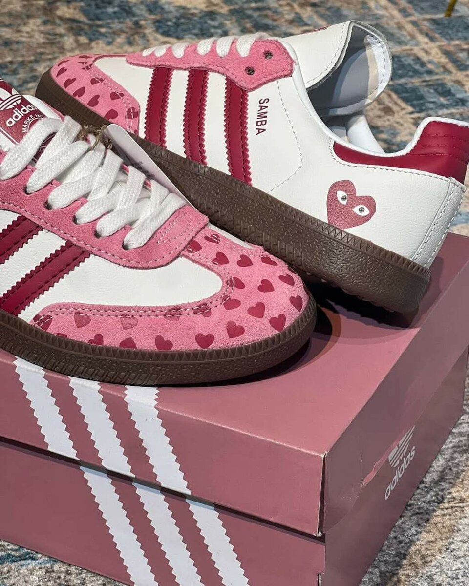 Découvrez les Adidas Samba au design cœur, parfaites pour les femmes qui aiment allier style et confort. Idéales pour le quotidien, elles apportent une touche romantique à votre tenue avec leurs motifs en cœur. Semelle durable et design classique assurent un look intemporel.