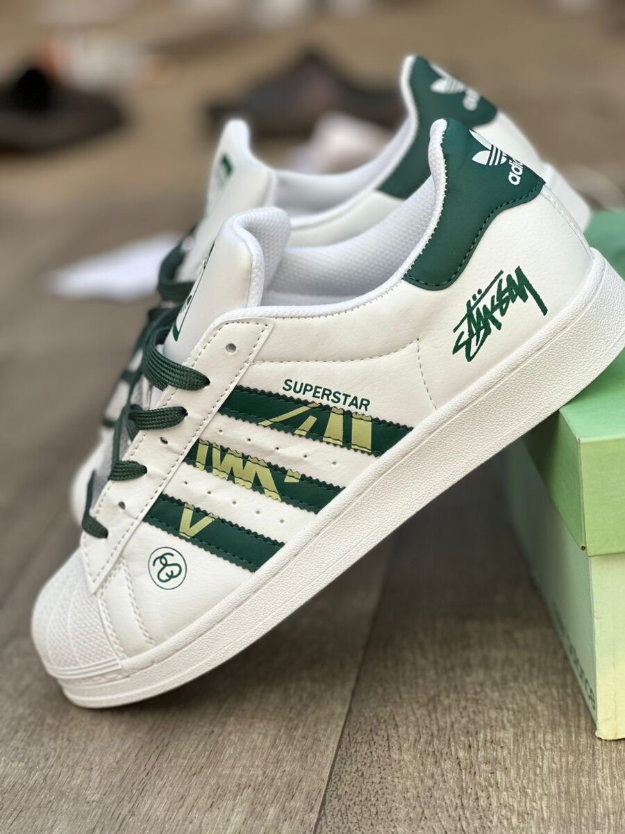 Découvrez les Adidas Superstar x Stussy, une collaboration unique pour un style streetwear élégant. Conçues pour les fans de mode, ces baskets blanches avec des accents verts sont parfaites pour les occasions décontractées.