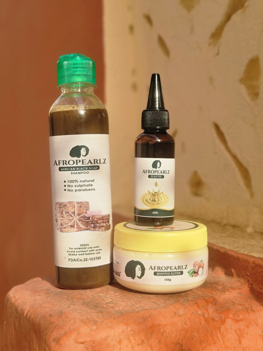 Basic Afro-textured haircare set. Includes, a shampoo, hair soufflé and Scalp elixir.