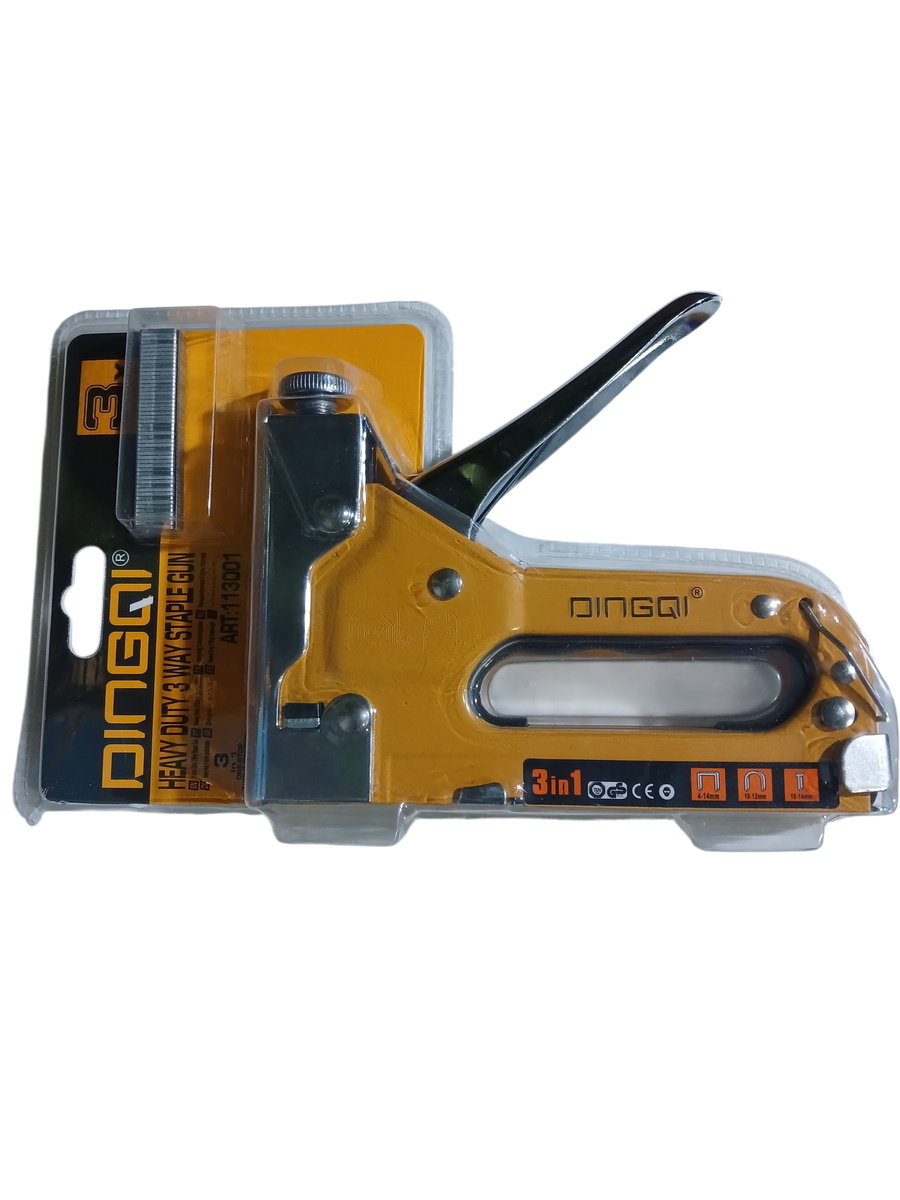 Agraphieuse robuste DINGQI 3-en-1, idéale pour les travaux domestiques et professionnels. Compatible avec divers types d'agrafes pour une fixation précise et efficace. Parfaite pour le bricolage et l'ameublement.