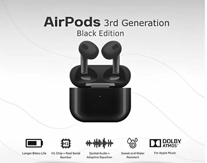 Découvrez les AirPods 3e Génération en Édition Noire, offrant une qualité sonore exceptionnelle avec Dolby Atmos. Conçus pour une utilisation prolongée grâce à une autonomie supérieure et résistants à l'eau et à la transpiration. Le compagnon idéal pour les utilisateurs d'Apple Music, avec une puce H1 pour une connectivité optimale.