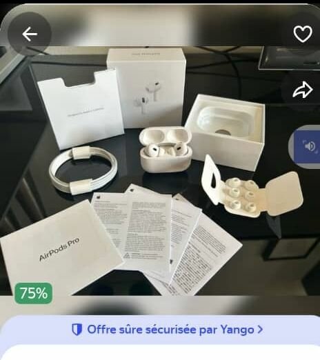 boîte d'écouteurs sans fil, probablement des AirPods Pro ou un modèle similaire avec des fonctionnalités avancées.