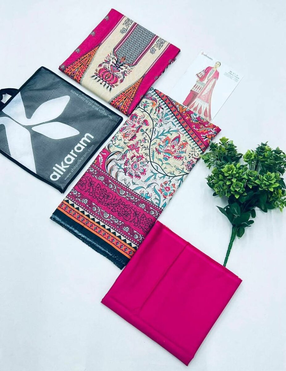 Alkaram 3 pieces 100% origional stock in hand Printed cambric shirt Printed voil dupatta Dyed cambric trouser