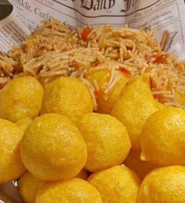 Galette jaune au vermicelle avec un pot de jus ( Bissap ou jus de gingembre)