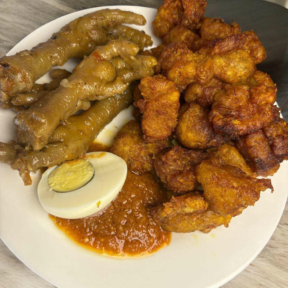 Alloco, edt un plat faut avec de la babane plantin découpe en dé et frire a l'huile specialité ivoirienne onctueux , accompagné de patte de poulet, gesier, rognon, saucisse