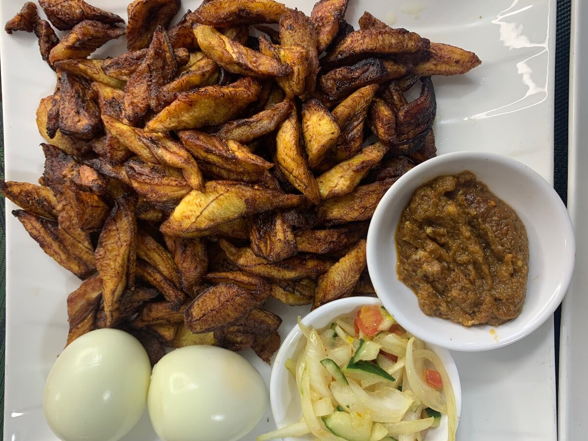 Alloco servi avec soit des oeufs, pattes de poulet ou des saucisses (2000f)
