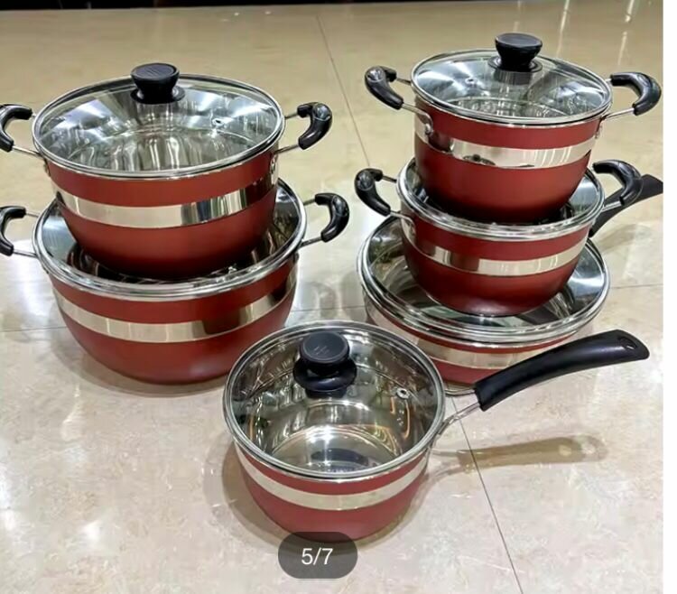 Contains 5 cooking pots 1 frying pan 6 glass lids (cover )