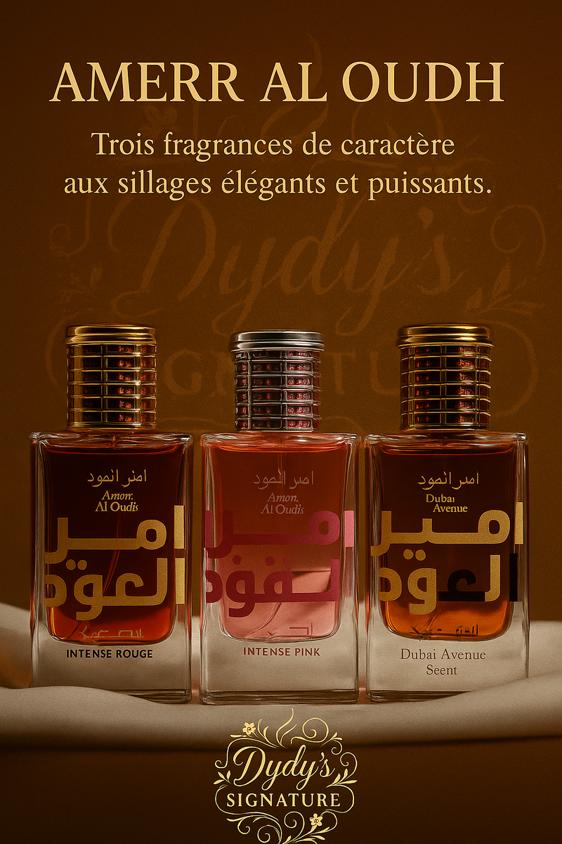 Découvrez Amerr Al Oudh: des parfums aux sillages élégants et puissants, disponibles en Intense Rouge, Intense Pink et Dubai Avenue. Idéal pour ceux qui cherchent une touche de luxe et d'élégance.