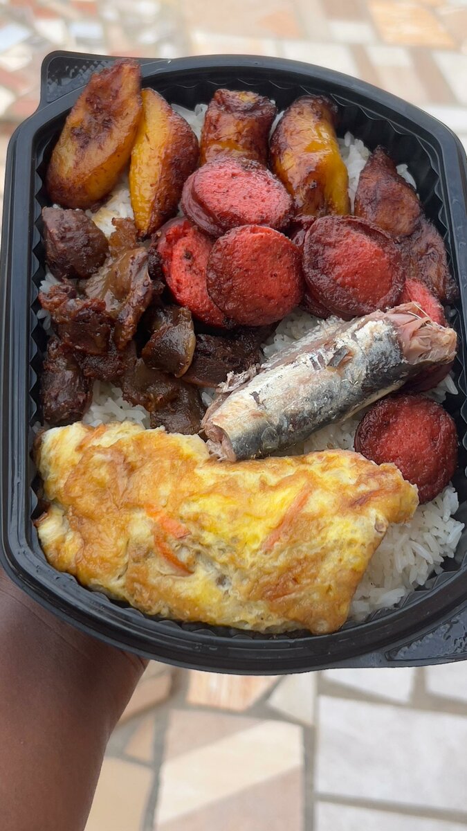 Oil rice/ Plantain/ Gizzard/ Sausage/ Fried egg / Pepper & Sardine