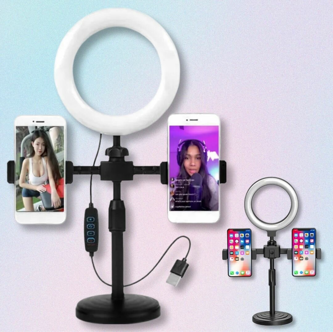 Optimisez vos vidéos avec notre anneau lumineux 6 pouces, idéal pour les créateurs de contenu. Sa base stable et ses bras ajustables pour deux téléphones garantissent un éclairage parfait. Parfait pour les vlogs, streams et selfies professionnels.