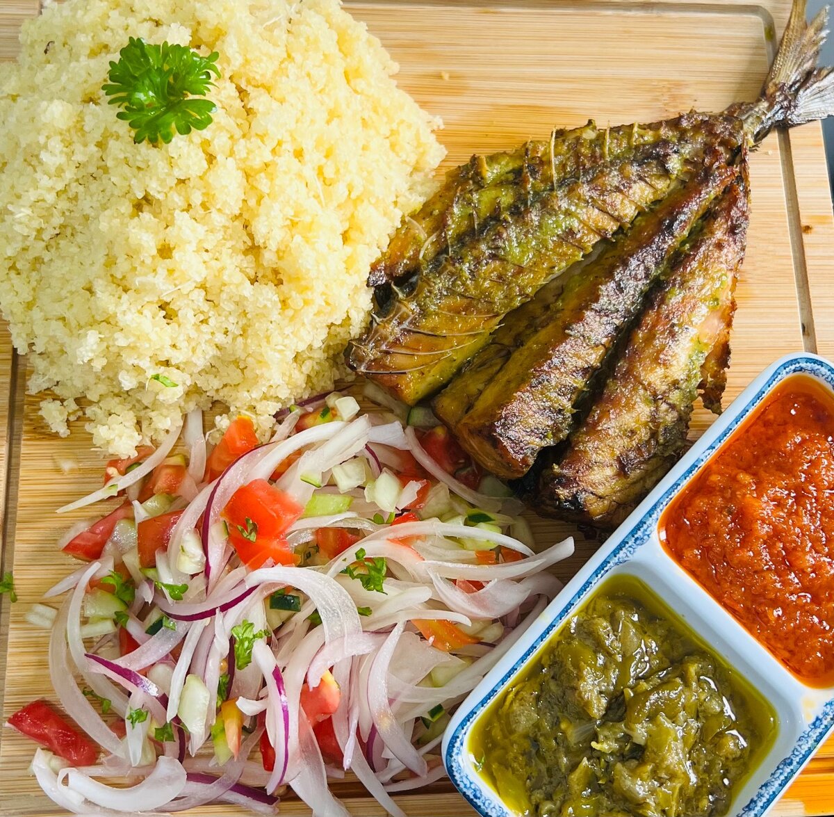 Savourez ce repas africain authentique composé de poisson frit parfaitement assaisonné, accompagné de légumes frais croquants et de sauces épicées. Idéal pour un dîner exotique et riche en saveurs.