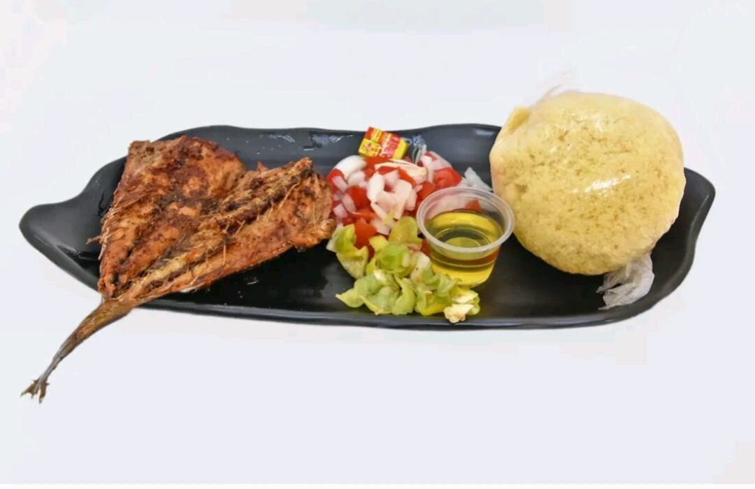 Savourez un délicieux plat de APF accompagné de légumes frais et d'une boule d'attieke
