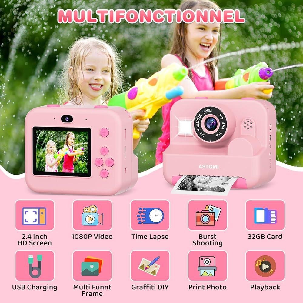 Appareil photo instantané enfants avec impression, écran IPS 2,4", vidéo HD 1080p et jeux intégrés. Créez des souvenirs ludiques avec des filtres amusants et un lecteur de musique. Idéal pour capturer chaque moment et stimuler la créativité de vos petits explorateurs.