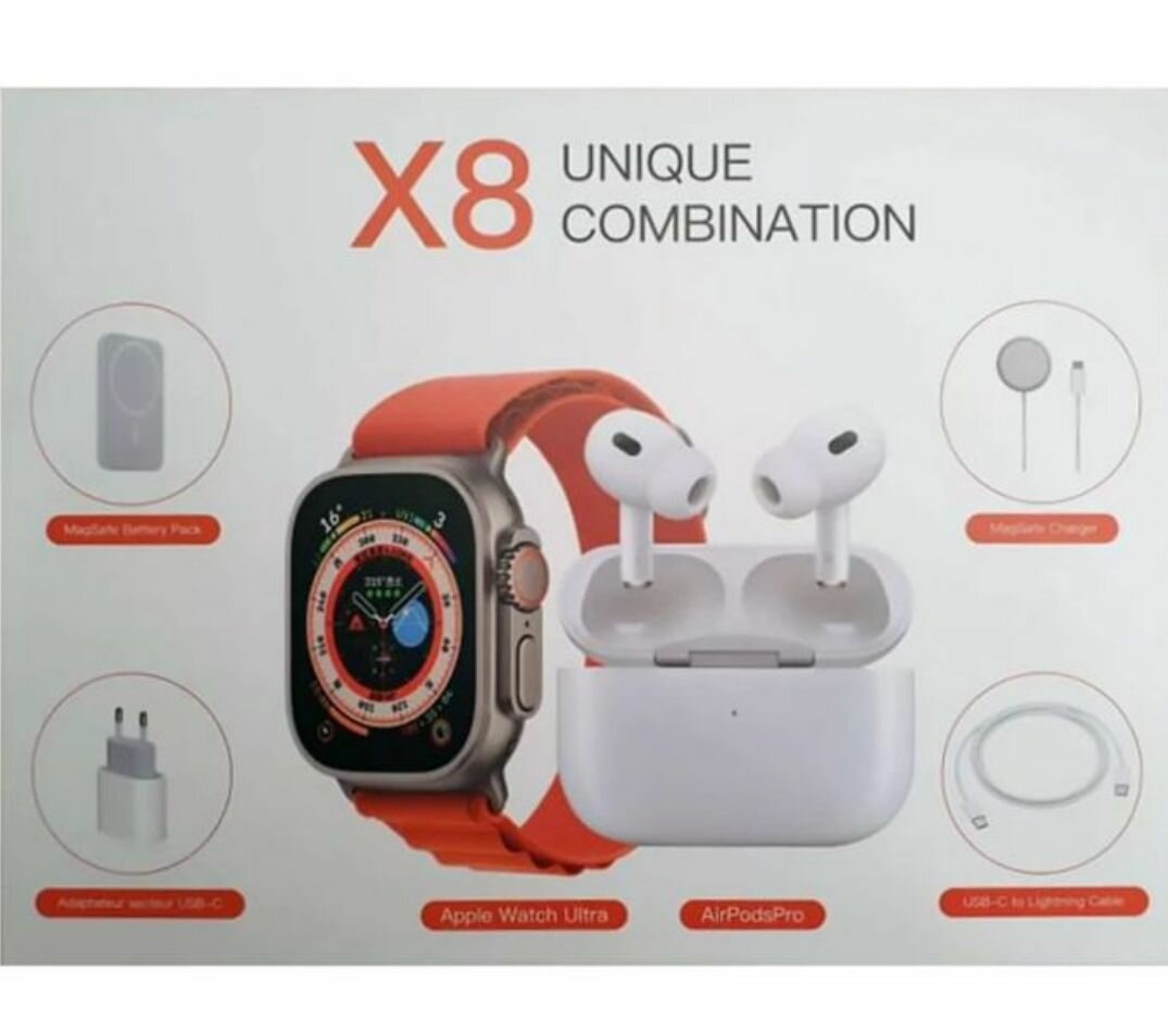Découvrez l'ensemble unique Apple Watch Ultra et AirPods Pro X8. Idéal pour les amateurs de technologie, ce combo offre une connectivité exceptionnelle et un son de qualité supérieure. Appréciez la polyvalence de l'Apple Watch avec ses fonctionnalités avancées, associée au confort et à l'audio immersif des AirPods Pro. Parfait pour le sport, le travail ou les loisirs.