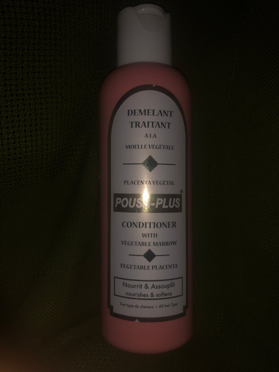 Revitalisant nourrissant Pouss-Plus à la moelle végétale et placenta végétal. Adoucit et assouplit tous types de cheveux. Idéal pour renforcer et hydrater vos cheveux chaque jour.