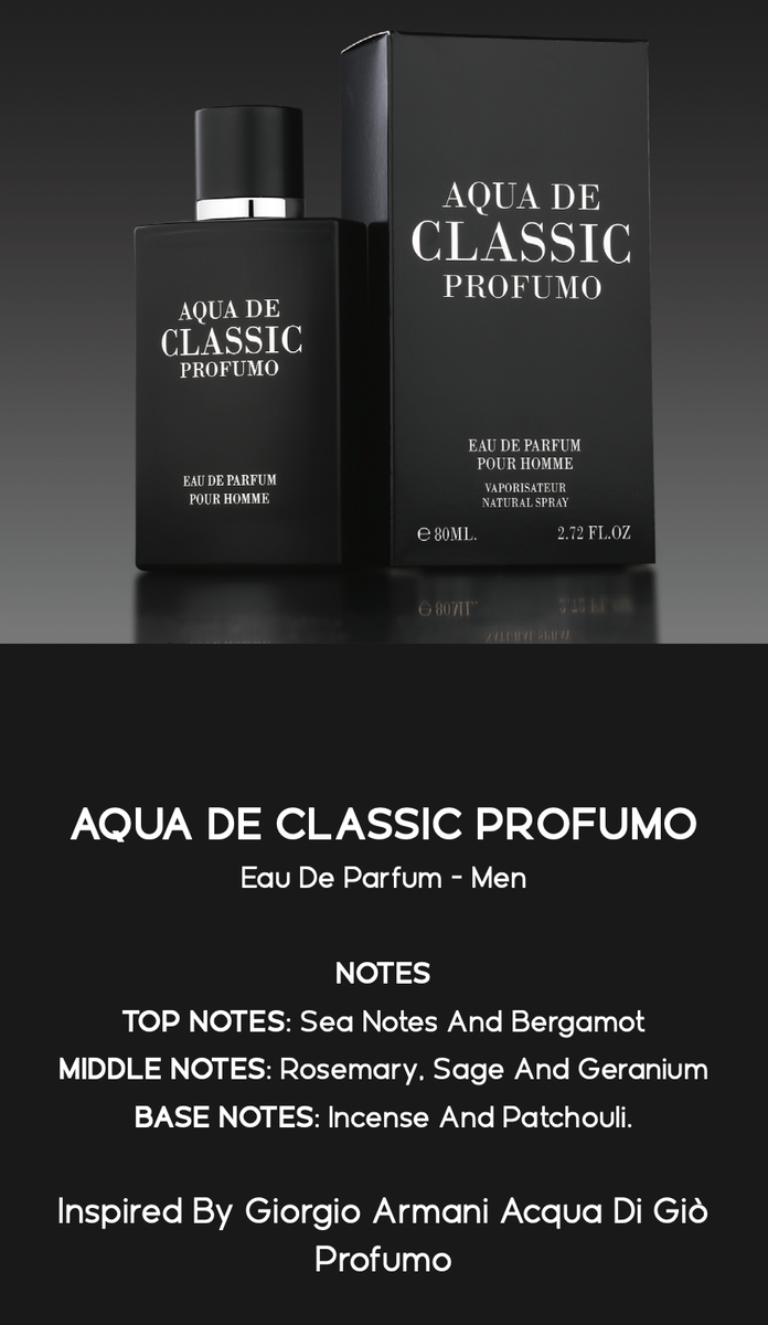 Découvrez Aqua De Classic Profumo, une eau de parfum pour homme inspirée par les essences marines et boisées. Parfaite pour un homme sophistiqué, elle combine des notes de tête de bergamote et de notes marines, un cœur de romarin et sauge, et se termine par un fond d'encens et de patchouli. Idéale pour toutes les occasions, elle incarne élégance et modernité.