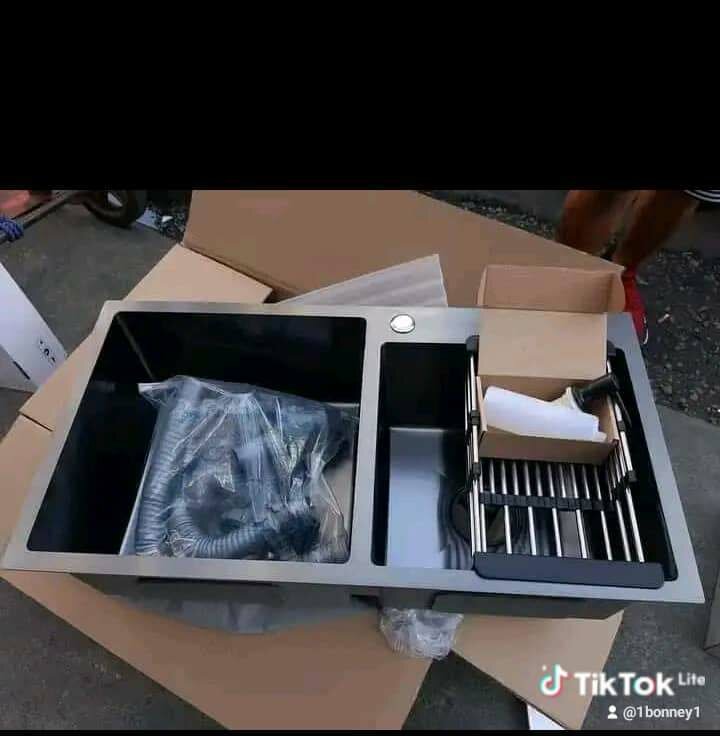 An armless kitchen sink and accessories package typically includes: drain or waste, soap dispenser and basket