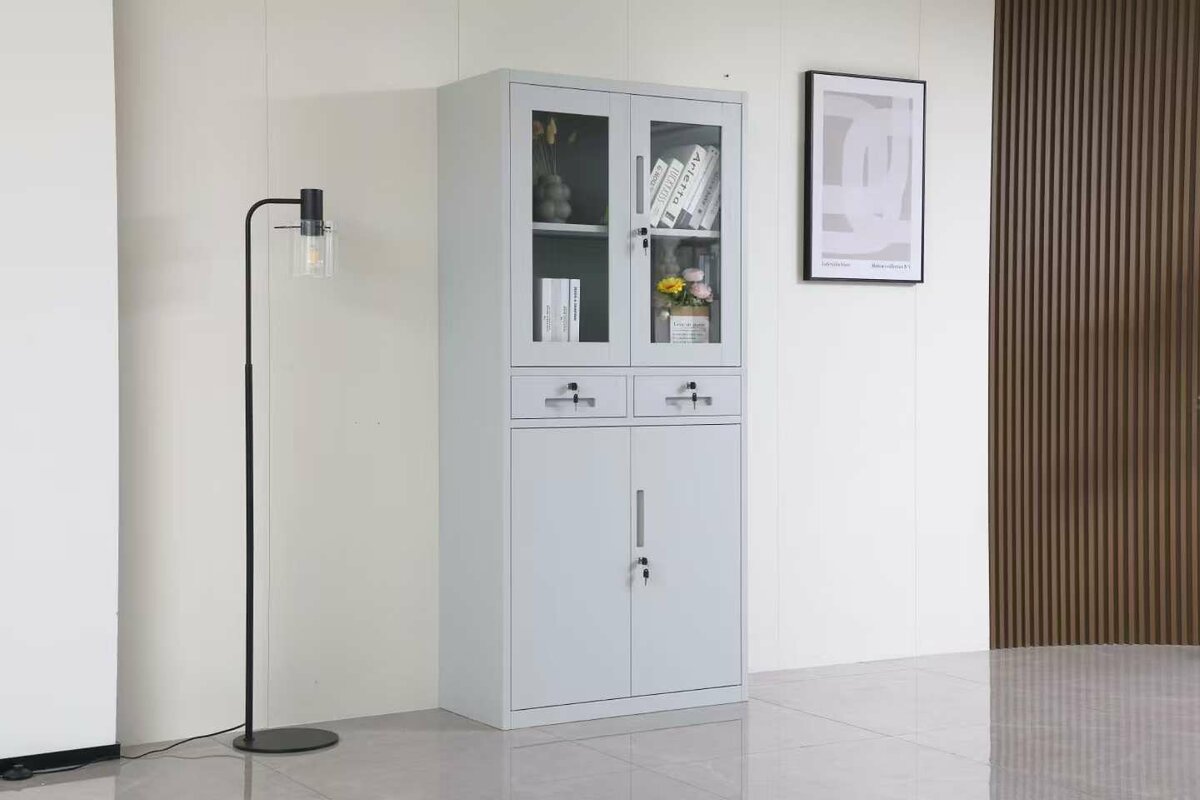 Armoire de rangement moderne avec portes vitrées. Idéale pour organiser livres et accessoires grâce à ses étagères spacieuses et sa construction robuste. Apportez une touche d'élégance à votre bureau ou salon. Parfait pour tous vos besoins de rangement.