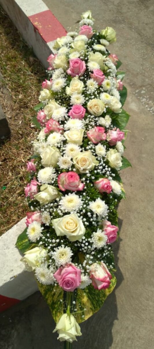 Une composition florale raffinée idéale pour les événements spéciaux. Cette élégante création mêle roses blanches et roses, rehaussées de délicates fleurs blanches. Parfaite pour embellir vos réceptions ou rendre hommage lors de cérémonies.