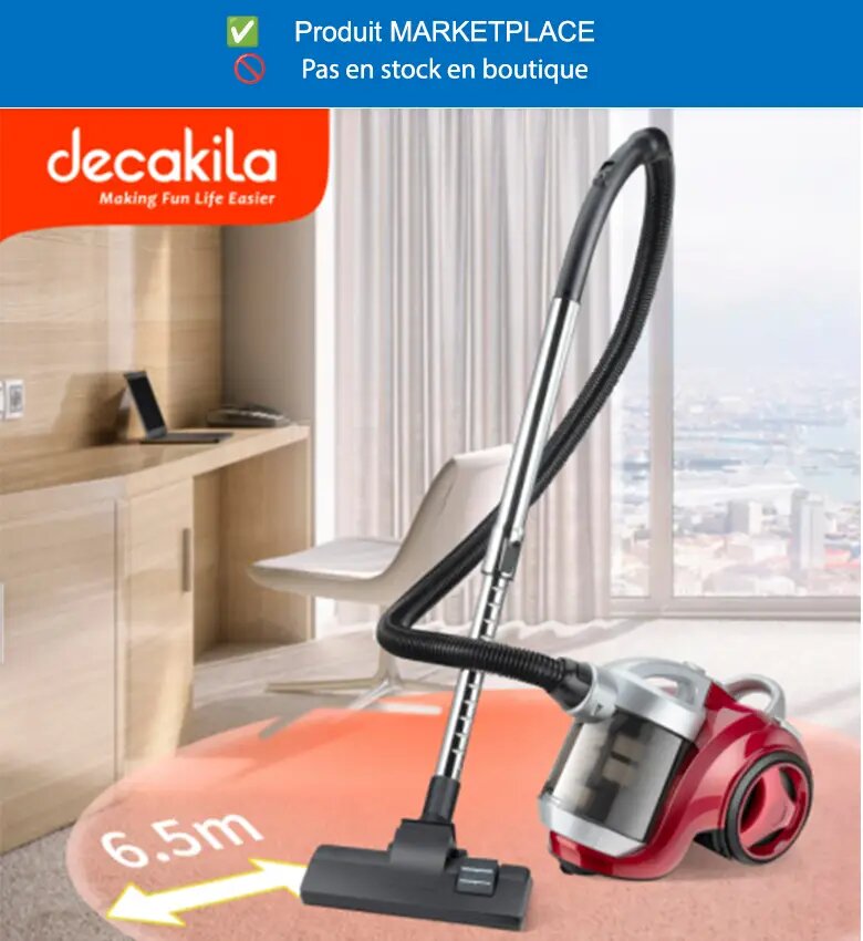 Découvrez l'aspirateur Decakila 1600W, idéal pour un nettoyage efficace avec sa capacité de 2.5L. Son design compact le rend facile à ranger. Sa puissance d'aspiration de 22kPa garantit un intérieur impeccable. Profitez d'une portée de 6.5m pour atteindre les coins difficiles.