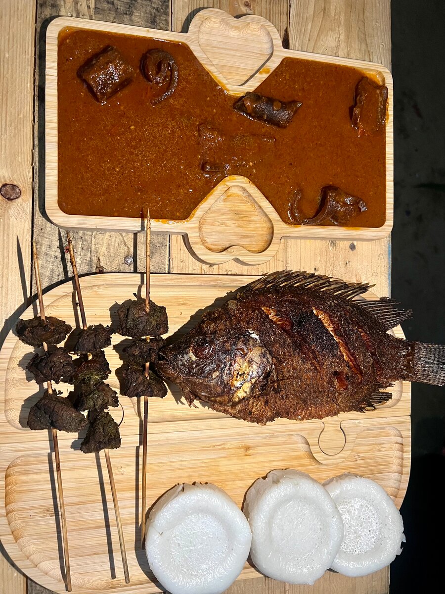 Savourez notre assiette d´abolo avec un bon poisson cap grillé à la perfection, accompagné de brochettes de viande tendre et de sauce épicée, Parfait pour un dîner exotique à la maison .