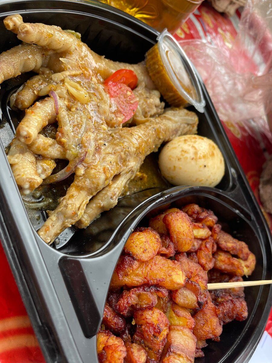 Savourez une assiette exotique et épicée avec des pattes de poulet savoureuses, un œuf mariné et des morceaux de viande grillée. Parfait pour explorer de nouvelles saveurs et déguster des spécialités uniques. Idéal pour les amateurs de cuisine audacieuse.