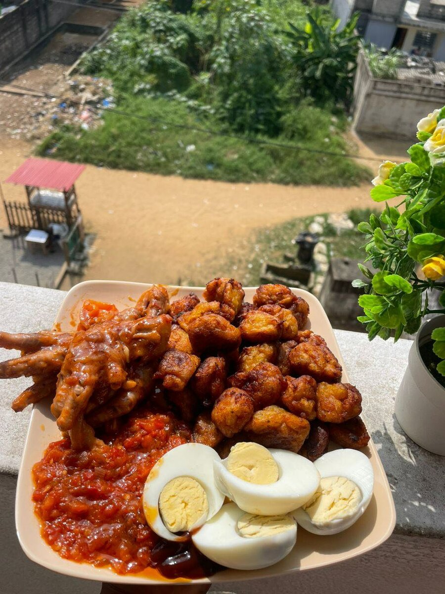 Découvrez notre assiette de dégustation avec ignames frites et œufs accompagnés d'une sauce épicée. Parfait pour les amateurs de cuisine exotique!