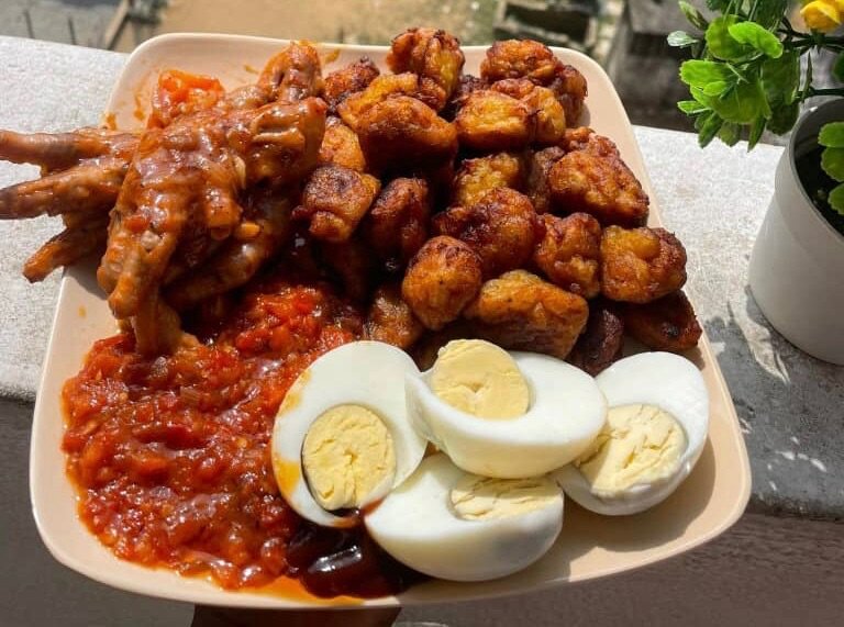 Découvrez notre assiette composée de savoureux beignets, œufs durs et pattes de poulet épicées accompagnées d'une sauce piquante. Un voyage culinaire au cœur de l'Afrique, idéal pour un repas convivial et plein de saveurs exotiques. Parfait pour partager lors de vos moments festifs.