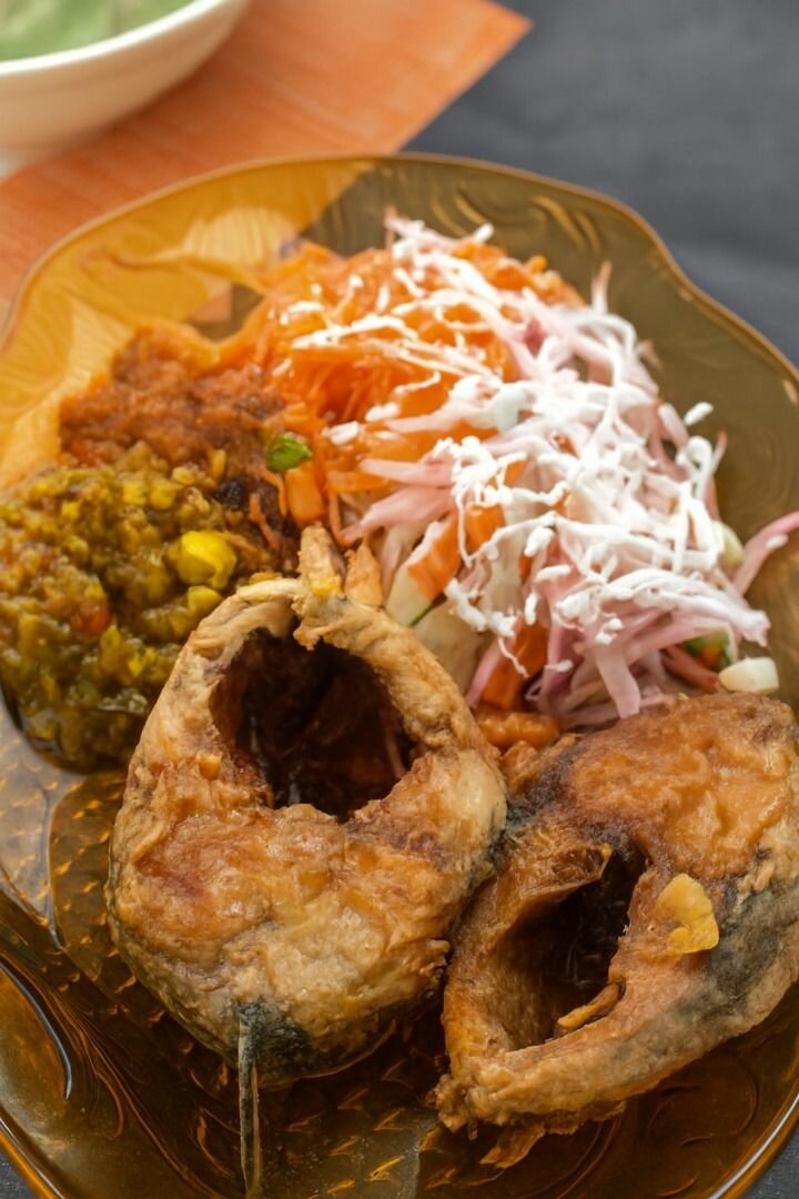 Savourez ce délicieux plat de poisson frit accompagné de légumes assaisonnés, idéal pour un déjeuner copieux. Parfait pour les amateurs de cuisine savoureuse.