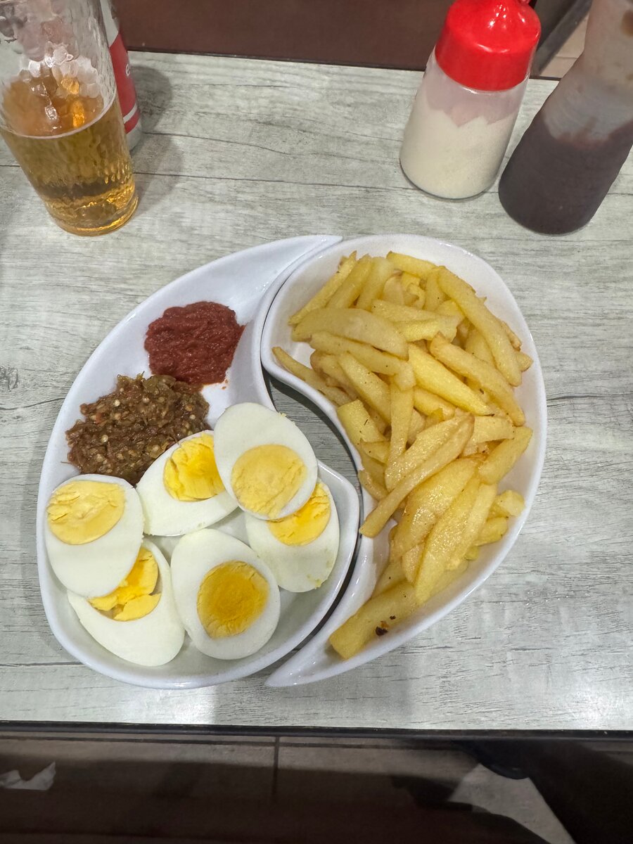Savourez cette délicieuse assiette composée de frites croustillantes et d'œufs durs, accompagnée de sauces épicées pour rehausser chaque bouchée. Parfait pour un repas rapide et savoureux à tout moment de la journée.