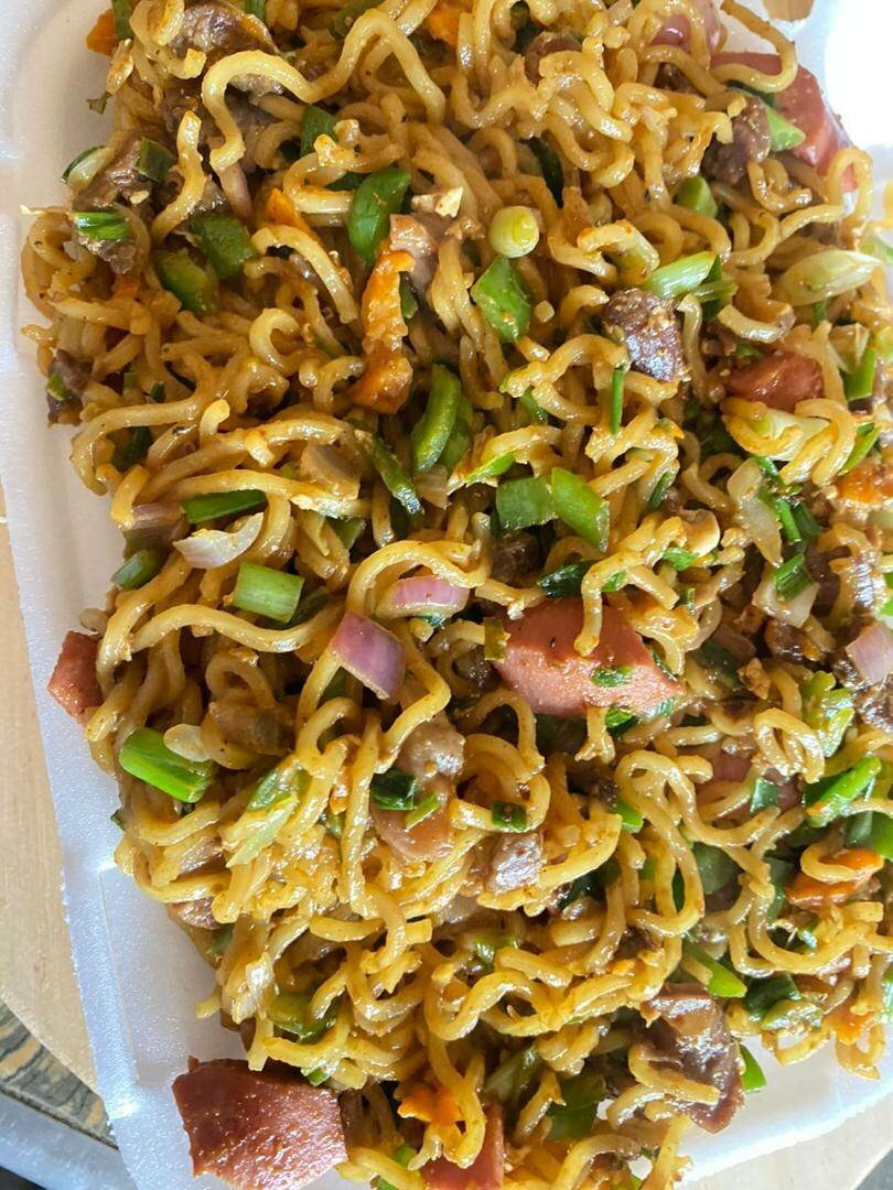Stir-fried noodles with gizzards,sausages and vibrant veggies.