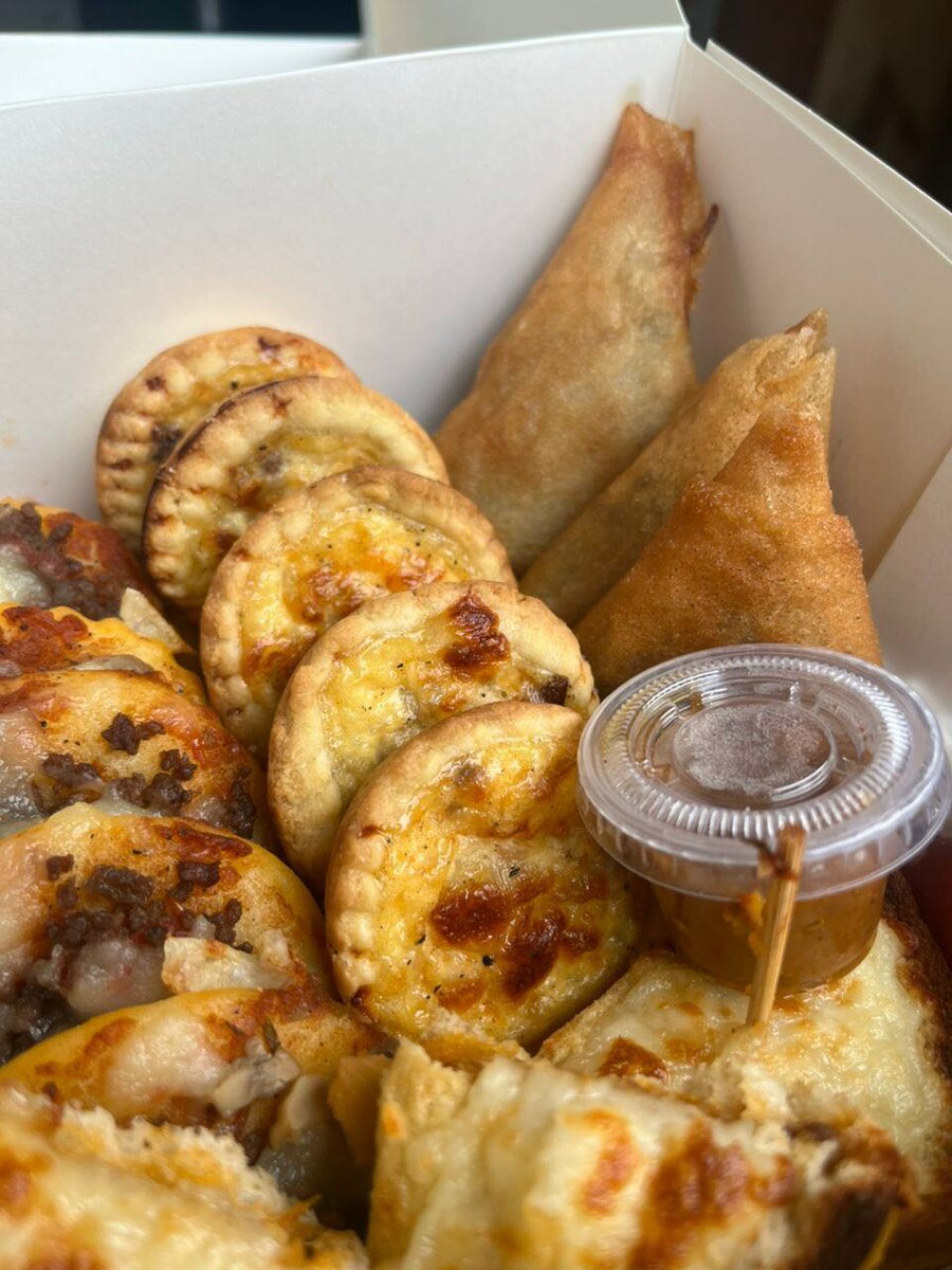 une mini box de mignardises composé de mini pizzas, quiche, samousa et croque monsieur La box idéal pour se régaler à petit prix