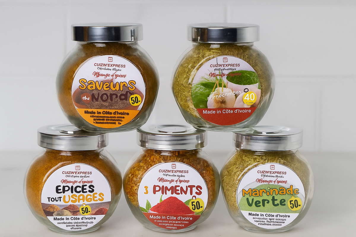 Découvrez cet assortiment d'épices authentiques de Côte d'Ivoire, idéal pour sublimer vos plats. Avec des mélanges uniques comme 'Saveurs du Nord', '3 Piments' et 'Marinade Verte', ces bocaux éveilleront vos sens et ajouteront une touche exotique à vos repas. Parfait pour les amateurs de cuisine du monde et les chefs à domicile.