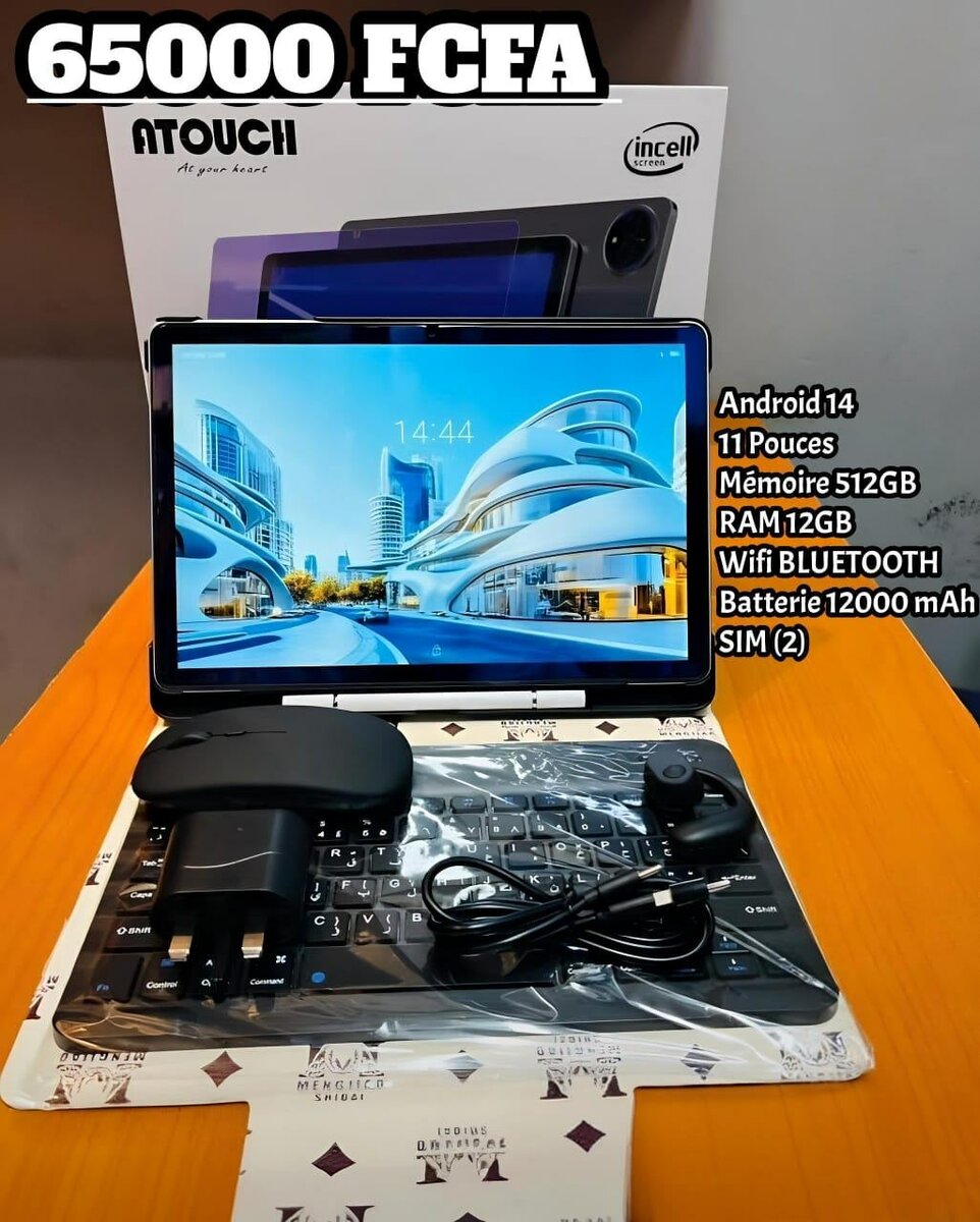 Tablette professionnelle Atouch Tab S9 Écran : 11 pouces blindé Ram : 12 GB Mémoire interne : 512 GB Carte sim : 2 Application : word, excel, YouTube, Facebook, WhatsApp etc... Batterie : 12000 Mah